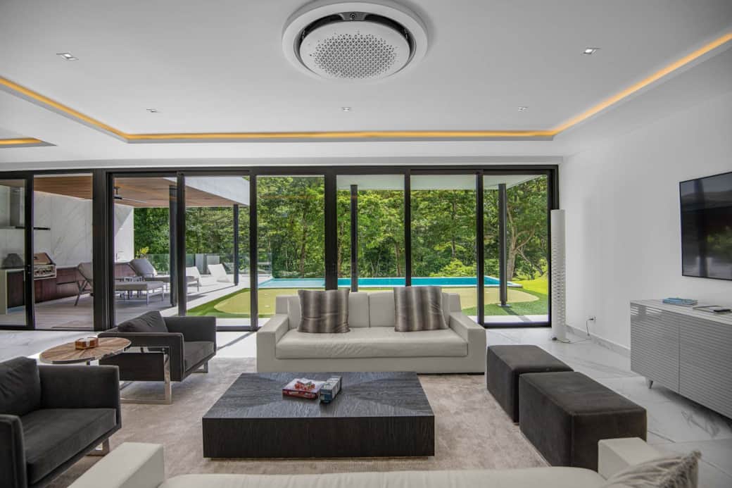 The main living areas are organized around an open-concept floor plan, enhanced by large-format marble flooring and recessed ceilings with soft indirect lighting. Floor-to-ceiling sliding glass doors fully retract, opening the interiors to the terrace and allowing uninterrupted views toward the 7th fairway.