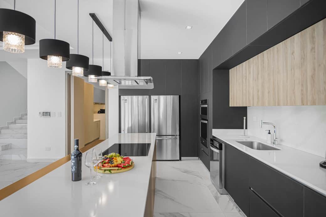 At the heart of the home is a chef-inspired kitchen, designed as both a functional workspace and a sculptural centerpiece. It features high-end appliances, custom contemporary cabinetry, a large waterfall-edge island with seating, wine storage, and premium finishes — fully equipped for effortless entertaining.